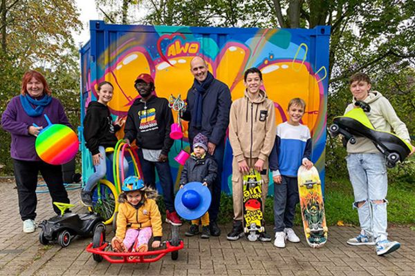 Magic Driver, Roller, Bälle, Hula Hoop und Springseile - über diese und viele andere Spielmaterialien dürfen sich die Kinder auf dem Gelände des AWO Aktiv- und Stadtteiltreffs im Stadtteil Wersten freuen. Dort wurde nun der neue Spielcontainer "Spico" offiziell eröffnet.